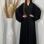 La abaya Boussaina noire en tissu Nida, fluide et légère, avec une coupe cloche élégante. Ornée de strass discrets, elle allie simplicité et raffinement pour un look chic en toute occasion.